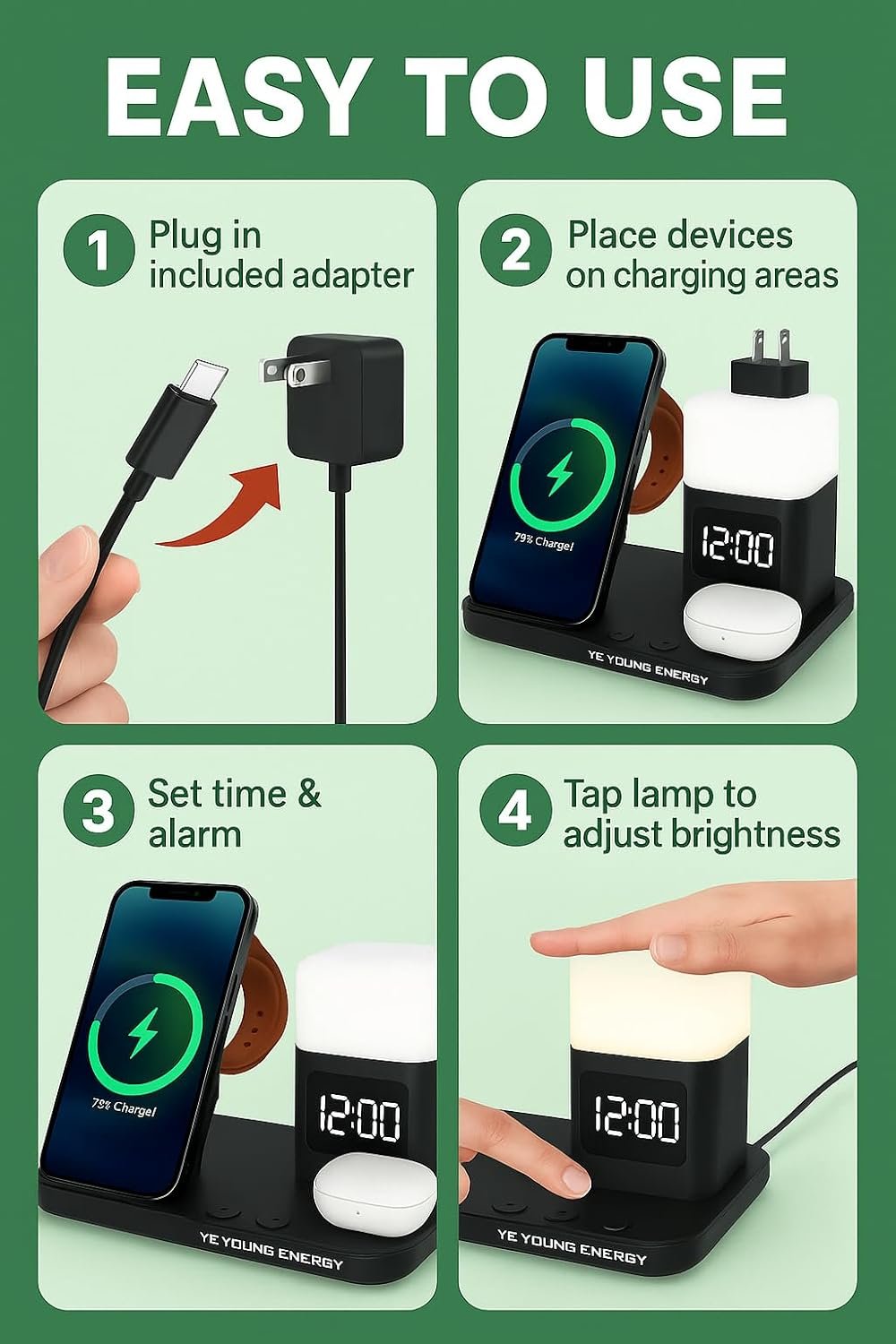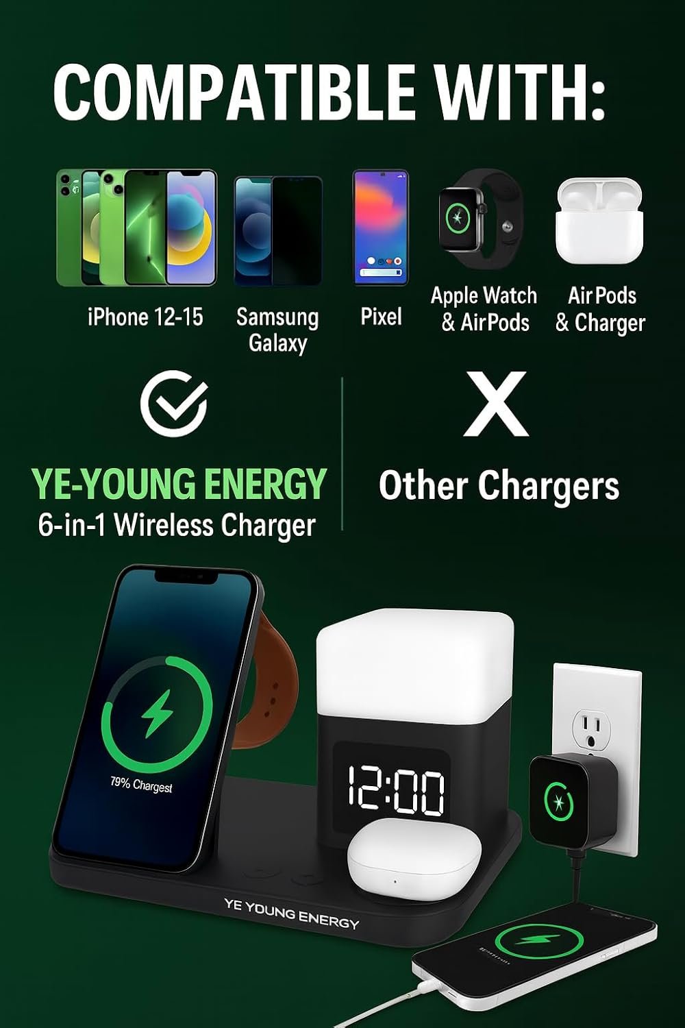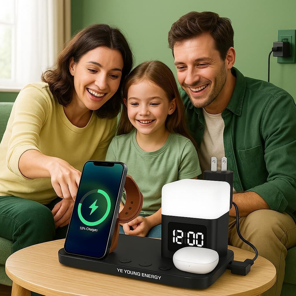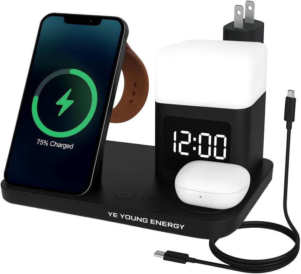 Charge iPhone, Samsung Galaxy, Pixel, Apple Watch & AirPods all at once with this clutter-free charging dock. Built-in LED alarm clock and soft night lamp make it the perfect nightstand charging station. Qi-certified for fast, safe wireless charging with protection against overheating, overvoltage & overcurrent. Compact & travel-ready for home, office, or on the go.