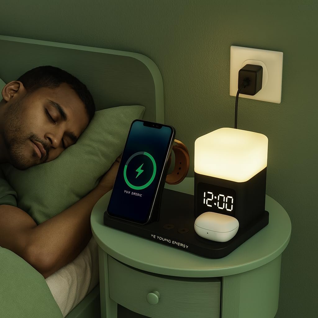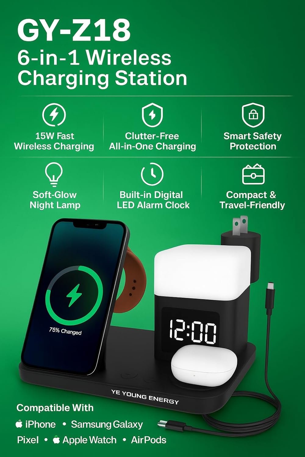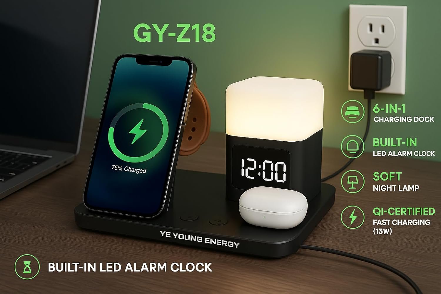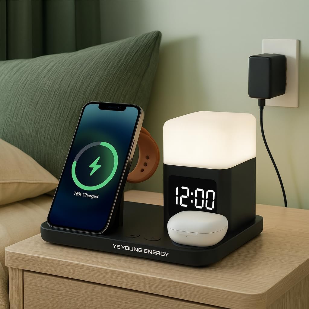 The GY-Z18 doubles as a nightstand charging dock and a desk charging hub organizer. It includes a built-in digital LED alarm clock with adjustable brightness and a soft night lamp, blending functionality with modern style.